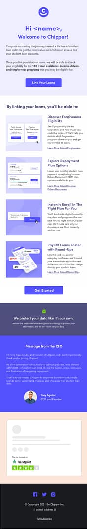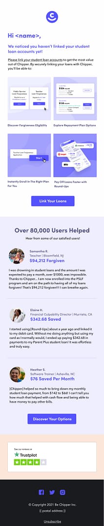 Users must register and link their student loans in order to access Chipper’s powerful loan management services. I created an automated email flow for registered users who had not linked their loans, highlighting the benefits of linking loans and addressing common blockers users face when trying to link their loans.